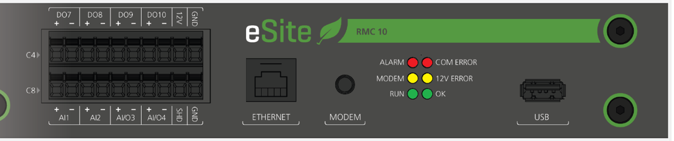 <table data-full-width="false"><thead><tr><th width="159">LED name</th><th width="118">Color</th><th>Indication</th><th>Comment</th></tr></thead><tbody><tr><td>ALARM</td><td>Red</td><td>Stable light indicates that one or more internal alarms of severity error (E) or fatal (F) is active.</td><td>Access information about active alarms from the eSite Web or via eSite Tools. Take necessary action(s) to solve any issues and reset active alarms.</td></tr><tr><td>MODEM</td><td>Yellow</td><td>Stable light indicates that IP address is received correctly and that the modem is connected.</td><td>Required for communication with eSite Tools. If the LED is off, verify that the SIM card is functional and has data available and that the antenna is connected properly.</td></tr><tr><td>RUN</td><td>Green</td><td>Stable light indicates that the main control application is up and running.</td><td>Main control application starts running approximately 80 s after initial system boot. If the LED stays off or is turned off outside this timeframe, the application is not running as expected. Reboot the system.</td></tr><tr><td>COM ERROR</td><td>Red</td><td>Indicates that any expected communication is not working. Stable light indicates that the main CPU is not communicating.</td><td>Possible hardware fault. Verify that all communication cables are connected properly.</td></tr><tr><td>12V ERROR</td><td>Yellow</td><td>Stable light indicates that internal or external 12 V supply is outside range (12 V ± 0.5 V)</td><td>Possible hardware fault. Connected sensors/devices may not receive adequate voltage supply. Measure voltage.</td></tr><tr><td>OK</td><td>Green</td><td>Stable light indicates system is operating with no active user alarms.</td><td>If this LED is off and the red ALARM LED is on, there may be issues on site that requires action.</td></tr></tbody></table>